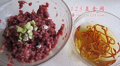 3、将鸽肉剁成肉末,加入盐、黄酒、生抽、蚝油、姜末、葱头拌匀,腌制30分钟。