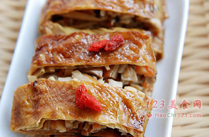 3、给豆油皮刷汁时适量即可,过多容易导致豆油皮易破。