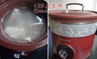 3、浮沫撇干净后全部倒入电磁紫砂煲,加入一只竖切为二的白萝卜同煮去膻味。