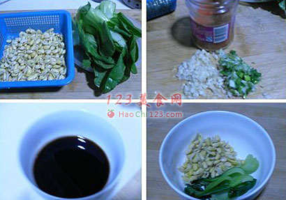 2、把油菜择洗干净。豆芽洗净,去皮。葱切花,蒜捣成蒜泥。