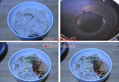 7、再放上葱花、蒜泥,辣椒面,倒上挑好的调味汁。