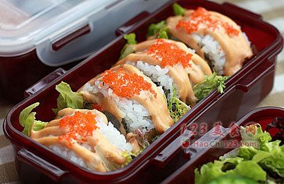 12、放入便当盒,旁边塞点生菜,挤上千岛沙拉酱。