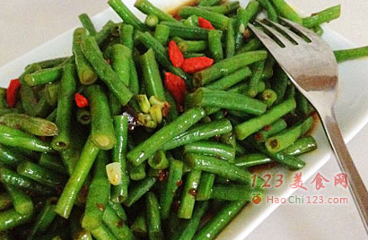 2、锅里放水后烧开,把豆角放在锅里煮熟后,放在凉水待用。锅里加少许油,放入几粒花椒炸香,然后再把花椒挑出来。