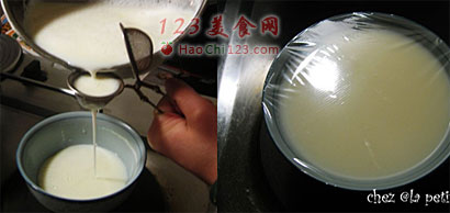 7、把搅拌好的蛋奶混合液慢慢地倒进原来装有奶皮的小碗里,为了使做出来的双皮奶更嫩滑,倒的时候请过筛,过滤一下(我家没有筛,我用的是隔茶渣的东西)。若操作得当,原来碗底的奶皮会浮起来,覆盖在混合液上。倒满后给小碗封上保鲜膜或者加上盖子(以防蒸的时候锅里的水掉进去使表面成凹凸不平的蜂窝状影响卖相)。