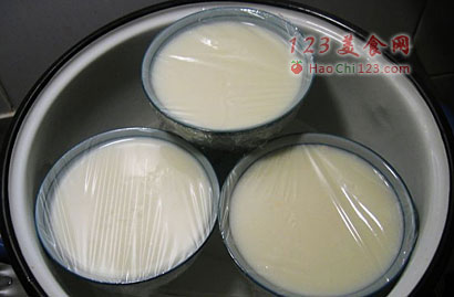 8、锅里烧水,水开后进锅蒸10分钟(时间长了蒸老了就不好吃了)。蒸好后请再闷两分钟再开盖,用筷子从中间刺入,没有牛奶流出说明全部凝结起来了,大功告成啦(多做几次有经验了,以后肉眼看就知道行不行了,不用再拿筷子戳了,否则影响卖相啊)。双皮奶就这么做好了!冷却,新的奶皮生成。是谓双皮奶!奶皮下面是嫩嫩的奶冻,样子像蒸水蛋。
