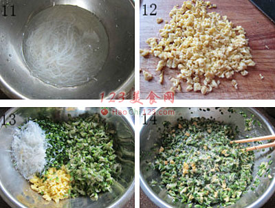 13、取一半槐花、一半韭菜,全部粉丝和炒蛋,槐花的量占总量的1/2。
