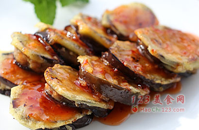 5、煎好的茄盒盛出来,整齐的摆放在盘中,再将泰式辣椒酱浇淋在煎好的茄子表面。[LaoYanHuo.com]