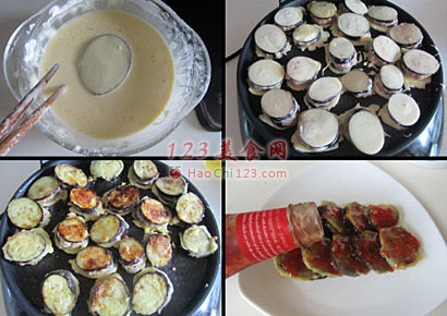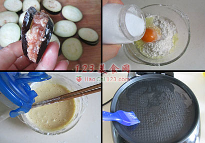 4、将准备好的茄盒放入鸡蛋面糊中,让其表面均匀的包裹面糊,再放入烧热好的电饼铛中煎至两面金黄。