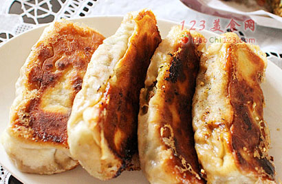 5、加入二大匙做法2馅料,放置在面片中心,抓起一边面片往里折,俩边顺势往内折入,最后包起成为长方型,收口朝下,放入抹有油的煎锅中排列整齐。