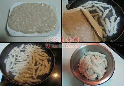 3、准备好一个完全的平盘(家里的盘子都有点凹,这很影响成型效果,拨出来的宽度不匀),用餐刀或筷子拨动鱼条下入到温水中,水温不要过高,以免下进去后散了,尽量做到粗细均匀。