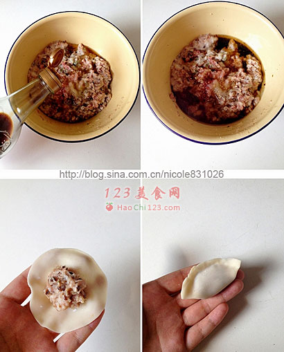 3、如果是买的饺子皮,通常或沾有一层薄薄的面粉,边缘沾点水容易捏紧,以免漏馅。