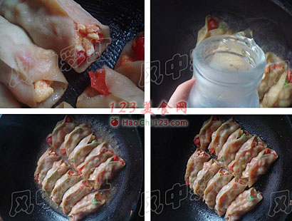 7、平底锅烧热,在锅底抹一层油,将锅贴摆入,盖上锅盖小火煎2-3分钟,待面皮将熟、底部有些焦黄时,倒入少许清水,再盖上盖子,煎至底部焦黄,锅中水分消失即可。