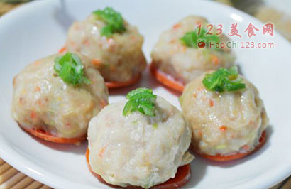 贴士:所有配菜匀需要一步步的放置,以便于判断最后要加多少水。切胡萝卜片摆在盘子底是避免肉丸子蒸熟后会丸子会粘在盘子里。蒸制时间由肉丸子大小来决定的,小些的话可以缩短时间,反之则延长。[LaoYanHuo.com]