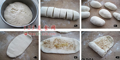 2、椒盐饼的制作:面板上撒少许干粉,将发酵好的面团揉匀,分成大小均匀的等份。
