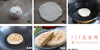 9、烙制:平底锅加热,锅中加少许食用油,将面饼放入锅中烙制。
