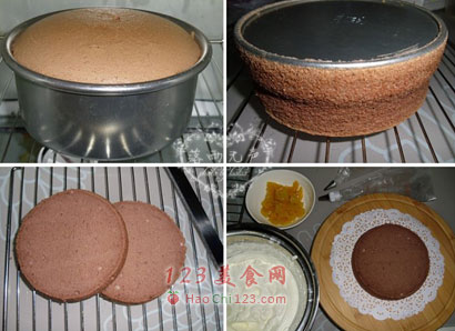 10、从烤箱里取出来,立即倒扣在冷却架上直到冷却,脱模放凉,即可用来做各种生日蛋糕了。