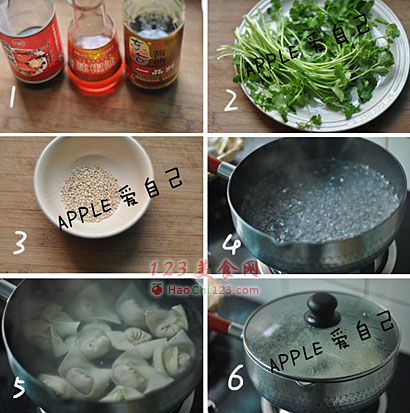 1、2、3、醋、酱油、辣椒油、香菜,香菜剁碎,熟的白芝麻。