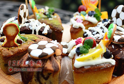 13、在白色糖霜中用牙签一点点加入食用色素调至适合的颜色,在彻底干透的白色糖霜底上画出世界杯的图案。
