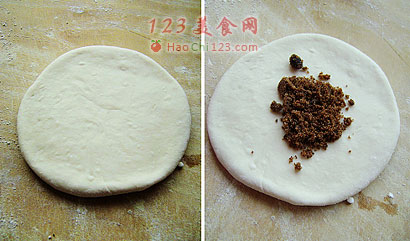 3、发好的面揪成剂子,用面杖擀成圆形薄片,放入红糖,红糖上撒点干面粉(这样防止糖溶化后流出来,混点面粉就好了)。