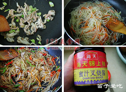5、依次加入盐,生抽,放入一小勺叉烧酱(会使菜有种特殊的味道),加入青椒丝继续翻炒。