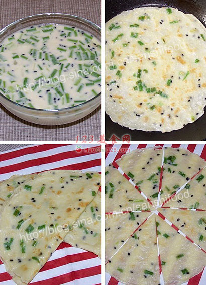 2、将面粉用水调成挂糊状,加入鸡蛋液、葱花、盐、黑芝麻调匀。