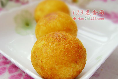 4、油锅烧至七成热,下圆子,中火炸熟。