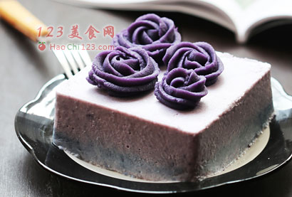 11、紫土豆粉30克加沸水56克,调成裱花泥,放入裱花袋中,中号玫瑰花嘴,裱上花即可。