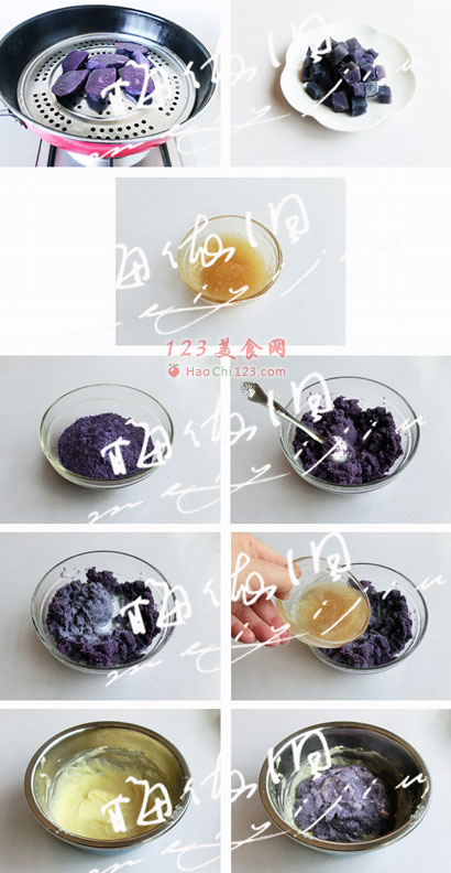3、紫土豆粉45克加120克沸水,调成150克紫土豆泥。