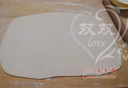 2、将其擀成长方形的面饼,厚度约0.5cm(揉面的时候就将其揉成长方形,不要滚圆,这样擀成长方形就不是难事了)。