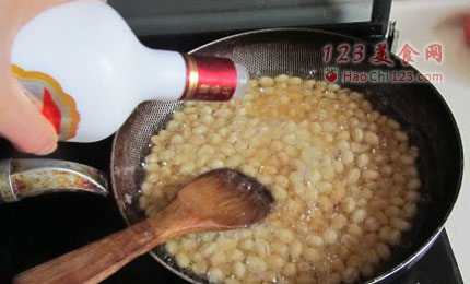 3、花生要炒得六分熟,即微微变色后加入少量的白酒,这样炸好的花生能长时间保持酥脆。