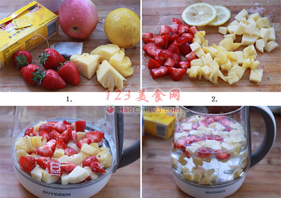 2、菠萝、草莓、苹果切丁,柠檬切片。