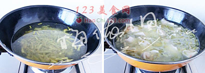 7、加入适量清水,烧开,下入云吞,煮熟即可(厨房小语:包云吞的时沾点清水抹在云吞皮四边再包,这样容易粘黏收口)。