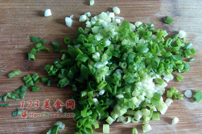 4、梅干菜和小葱拌匀,加植物油、盐和糖拌匀,油要稍微多放一些。