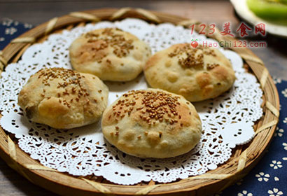 3、以前都用石板烤披萨和面包,这还是第一次烤小饼呢,效果很不错!南方的梅干菜饼都是加肥肉的,我做的是素食版。加了很多小葱,也非常香呢![LaoYanHuo.com]