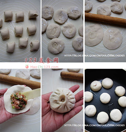 9、将剂子擀皮,就和擀饺子一样,挑上多多的馅料,包成菊花顶的小包子形状。