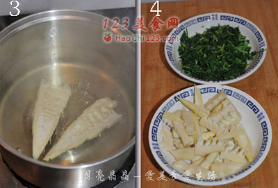4、马兰攥干水分切碎,春笋拍松切成条。