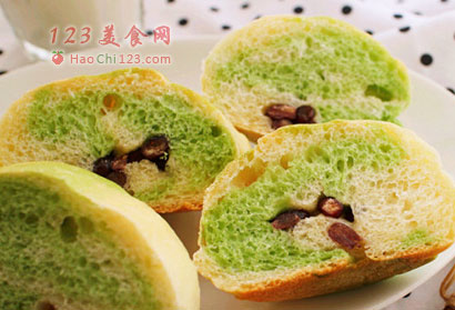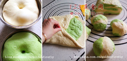 5、将两个面团排气,白色面团杆成大平面后包入绿色面团,后压扁卷成筒状,加盖松弛20分钟。