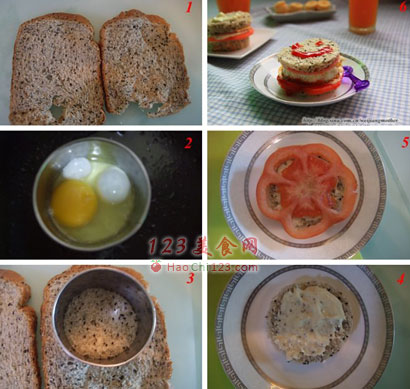 3、面包片上挤上沙拉酱,依次放入番茄片,奶酪片,煎蛋和火腿片(图4,图5)。