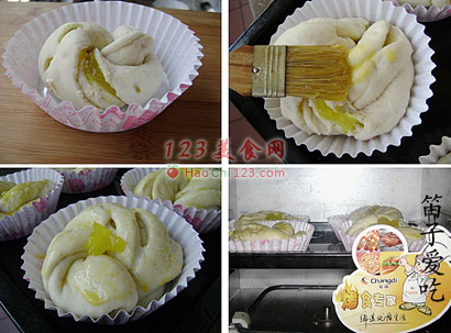 5、烤箱里进行二次发酵,表面刷蛋液,点缀点果酱。