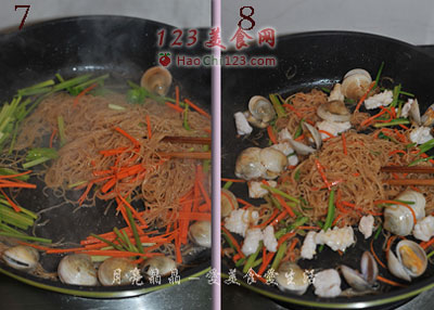 7、炒到锅中汤汁基本收尽,倒入蔬菜丝继续翻炒至米粉干爽,蛤蜊开口。