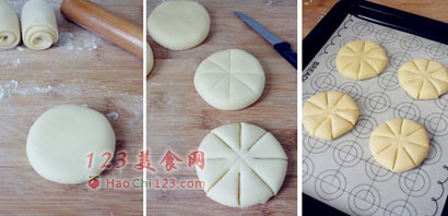 8、先用刀给椰蓉包打上4道对称的划痕,然后再用小刀将3/2处割开成花瓣样。