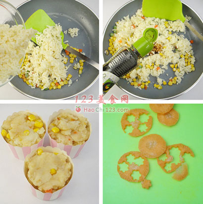 13、苦菊生菜插进土豆泥中,胡萝卜切小花装饰。