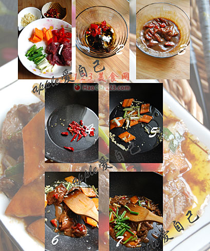 2、3、腌制牛肉片:1.5匙豆瓣酱、1匙甜面酱、半匙生抽、1匙香醋、半匙芝麻油、1匙生粉、少许朝天椒抓匀腌制5分钟。
