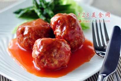12、烤好的丸子和蔬菜装盘,浇上芡汁,即可享用。