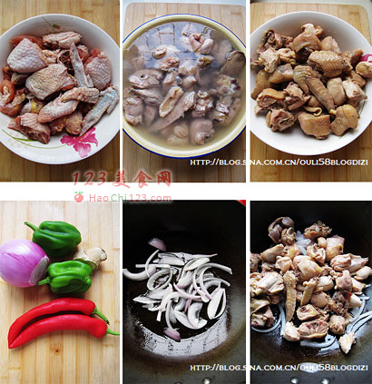 3、洋葱切成丝,姜切片,青红椒撕块。