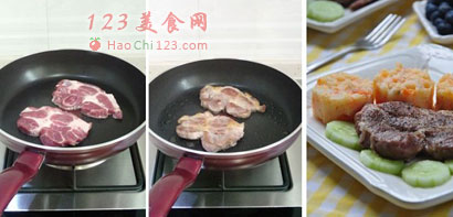 9、用饼干模具给土豆胡萝卜泥塑形后摆入盘子中,在煎好的猪排上现磨些黑胡椒碎,再搭配几片黄瓜片即成。