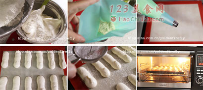 7、在挤好的手指饼干糊上洒上糖粉,共洒两次(期间停顿30秒再洒)。