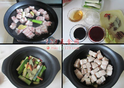 3、先将葱段和姜片铺在锅底,再放上焯过水的五花肉,这样使得五花肉不接触锅底,避免扒锅;再将4碗调味料倒入。