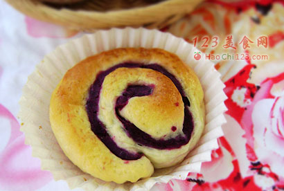 3、铺上紫薯馅,然后抹平,卷起来,切小段,切面向上放纸杯里(卷得不用心,丑死啦)。