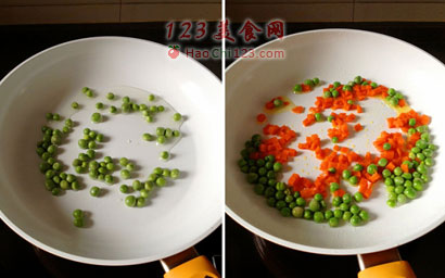 2、炒到豌豆发皱,放入胡萝卜丁。